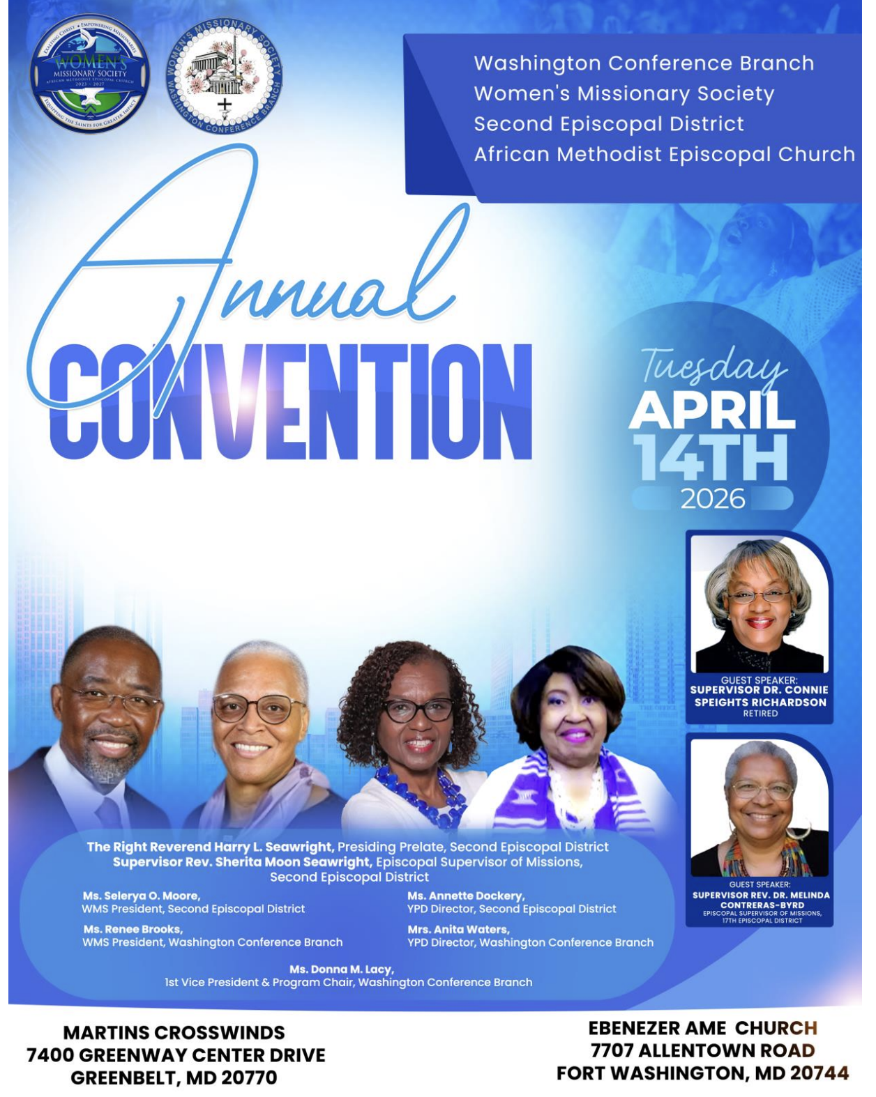 The WCB-WMS Annual Day Convention, which will be held on Tuesday, April 14, 2026, at 7:15 a.m. at Martin’s Crosswinds in Greenbelt, MD. Onsite registration closes at 9:00 am, so if you arrive after 9:00 am, you will not be permitted to vote. The cost of the Annual Day Convention is $135.00.
